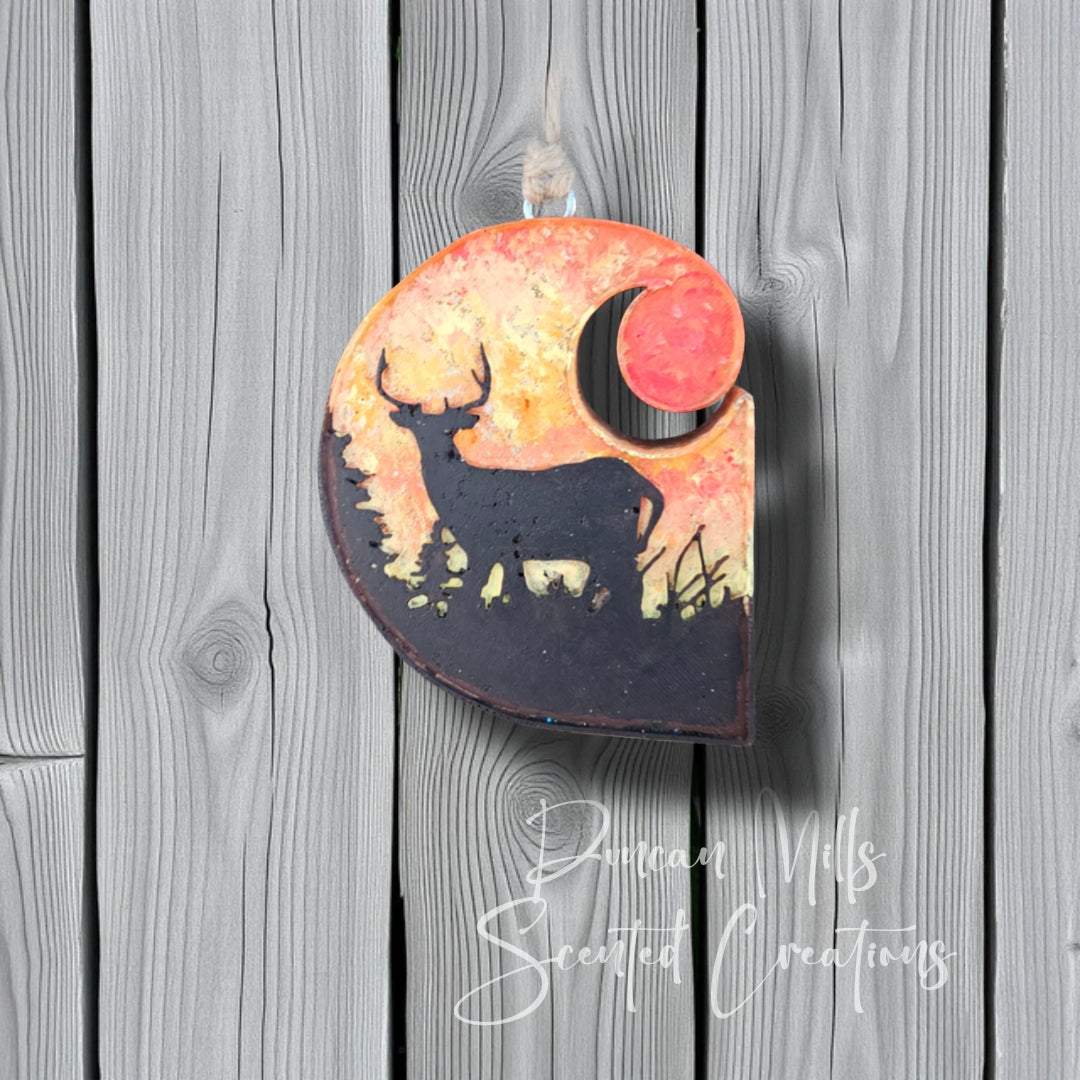 Carhartt Deer scene Freshie. Hand made & painted. Approximately 5 x 5 inches. This will fill your vehicle or room with beautiful scent.
